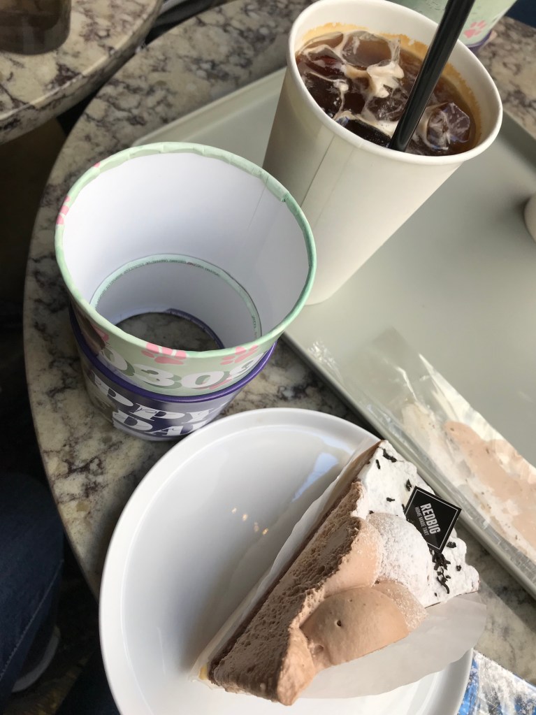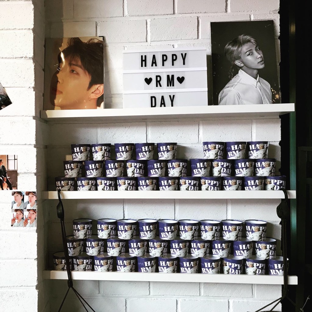 This specific cafe was celebrating one of the BTS member’s birthday, RM. It was adorable! I loved the vibe of the cafe; it was aesthetically pleasing, and the cafe workers were super sweet. They gave us 6 extra RM-themed cup holders for the birthday celebration. It was also very relaxing to just sit, sip coffee and eat some tart cake!